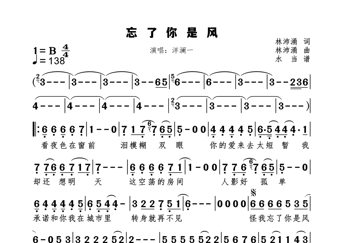 《忘了你是风》是洋澜一演唱的一首歌曲,拍号为4/4拍,歌曲速度为每分钟138拍,这份简谱共有一张高清图谱,图谱由 @水当 编配上传。