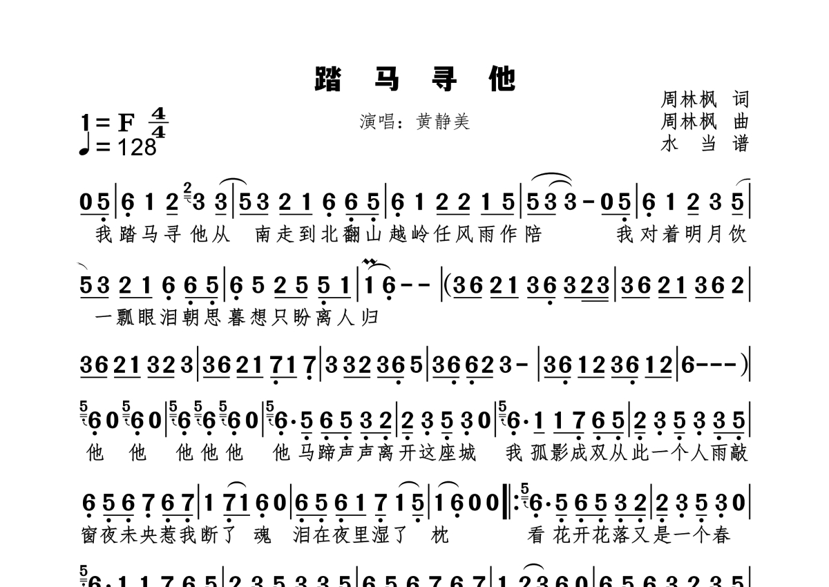 《踏马寻他》是黄静美演唱的一首歌曲,拍号为4/4拍,歌曲速度为每分钟128拍,这份简谱共有一张高清图谱,图谱由 @水当 编配上传。