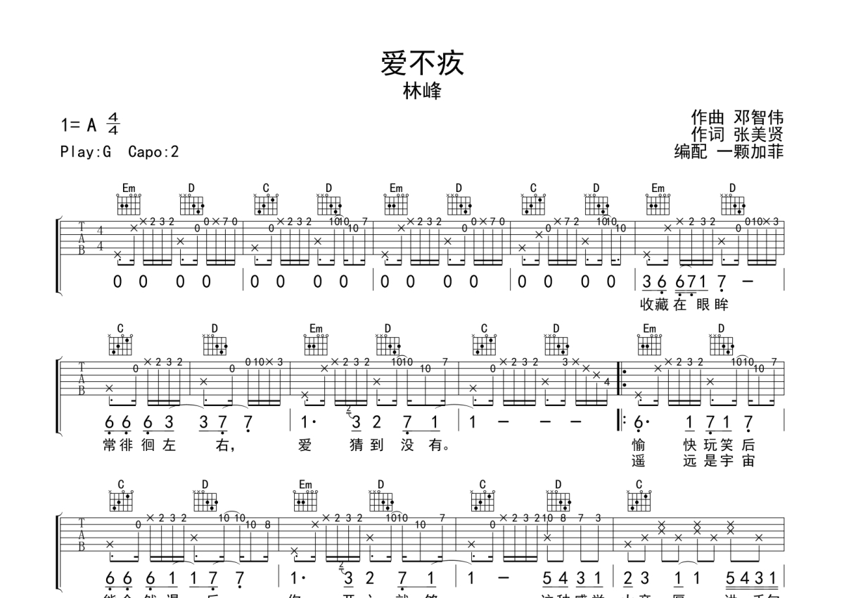 爱不疚吉他谱 - 林峰演唱 - G调弹唱六线谱