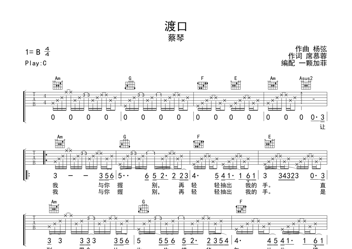 蔡琴《渡口》吉他谱 - C调弹唱六线谱
