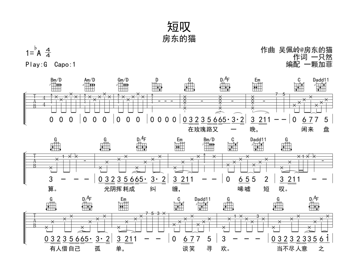 短叹吉他谱 - 房东的猫演唱 - G调弹唱六线谱