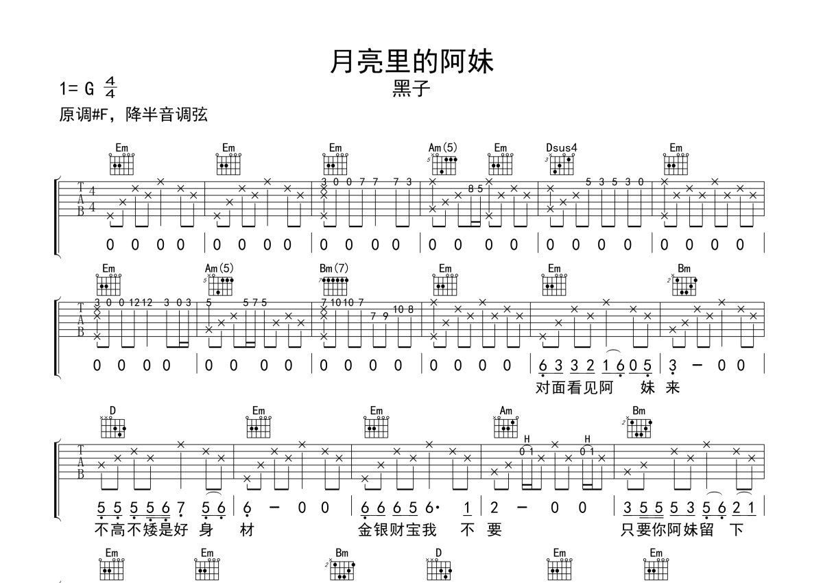 黑子《月亮里的阿妹》吉他谱 - G调弹唱六线谱 - 免翻页版