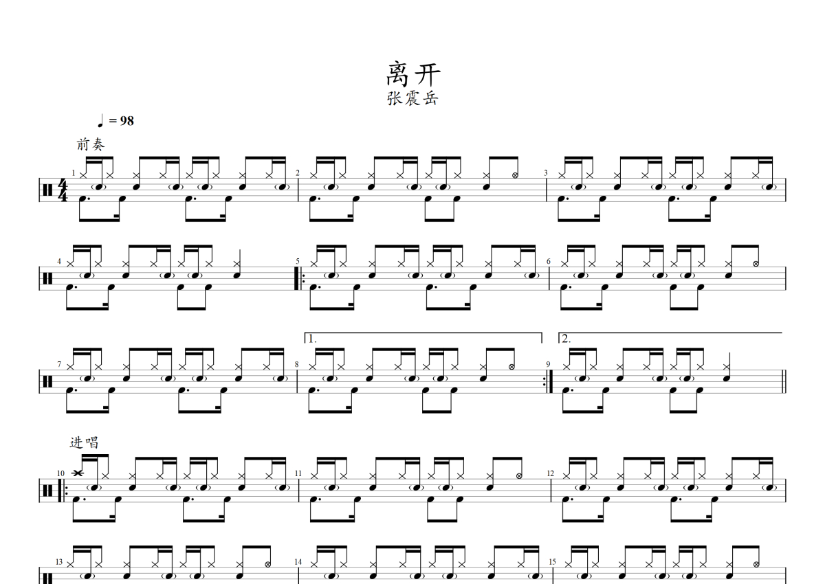 《离开》是张震岳演唱的一首歌曲,拍号为4/4拍,歌曲速度为每分钟98拍,这份架子鼓谱共有三张高清图谱,图谱由 @音符喷血者 编配上传,图谱使用五线谱编配,使用这份离开架子鼓谱,你将能够轻松地敲打出这首张震岳的离开,快来尝试吧。