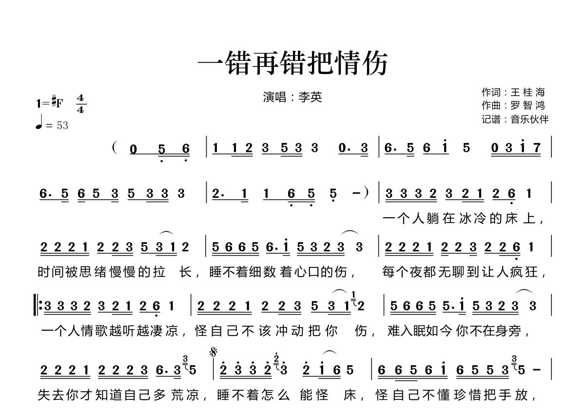 《一错再错把情伤》是李英演唱的一首歌曲,拍号为4/4拍,歌曲速度为每分钟53拍,这份简谱共有一张高清图谱,图谱由 @音乐伙伴 编配上传。