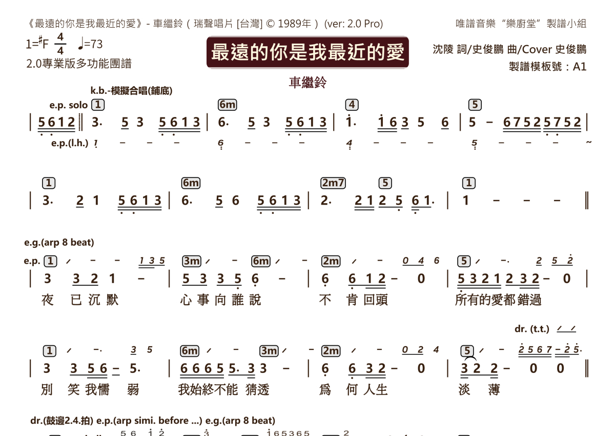 《最远的你是我最近的爱》是车继铃演唱的一首歌曲,2.0版多功能团谱,这份乐队总谱共有两张高清图谱,图谱由 @唯谱音乐"乐厨堂"发布小组 编配上传。
