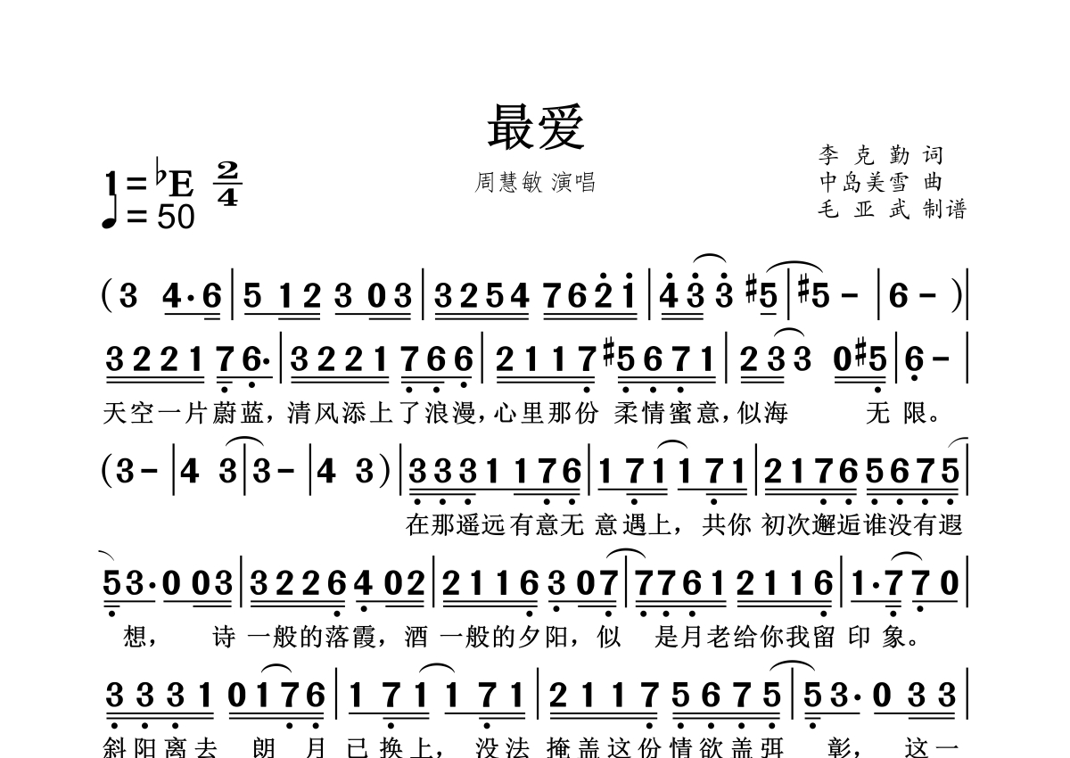 《最爱》是周慧敏演唱的一首歌曲,拍号为2/4拍,这份简谱共有一张高清图谱,图谱由 @秋天的童话 编配上传。