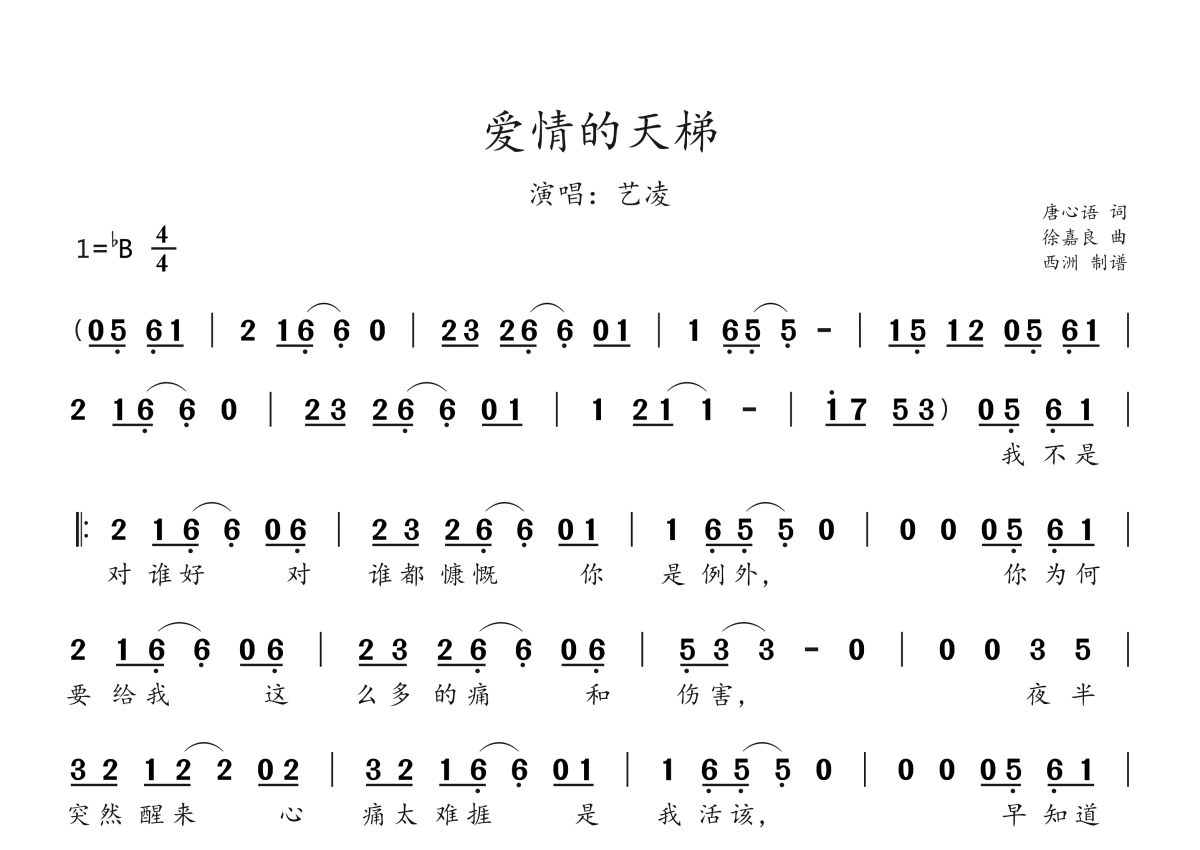 《爱情的天梯》是艺凌演唱的一首歌曲,这份简谱共有一张高清图谱,图谱由 @西洲 编配上传《爱情的天梯》是艺凌演唱的一首歌曲,拍号为4/4拍,这份简谱共有一张高清图谱,图谱由 @西洲 编配上传。