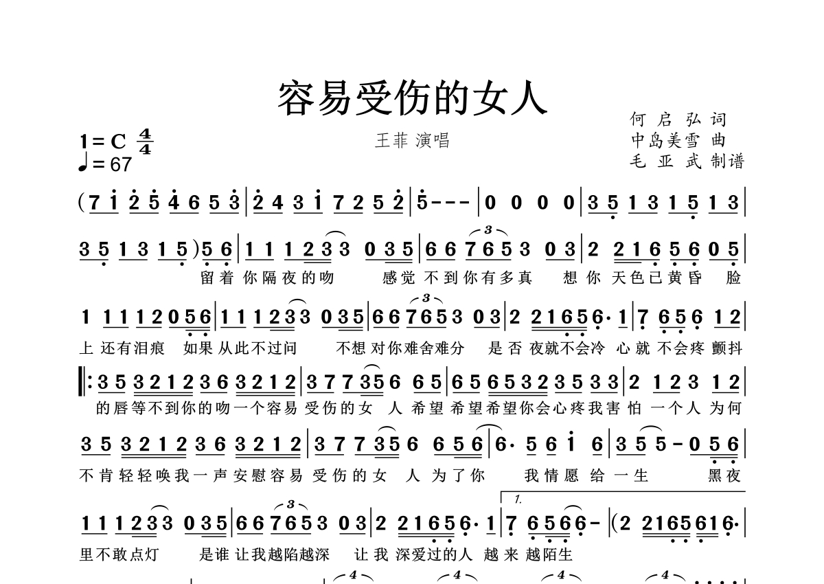 容易受伤的女人(国语)简谱 - 王菲演唱