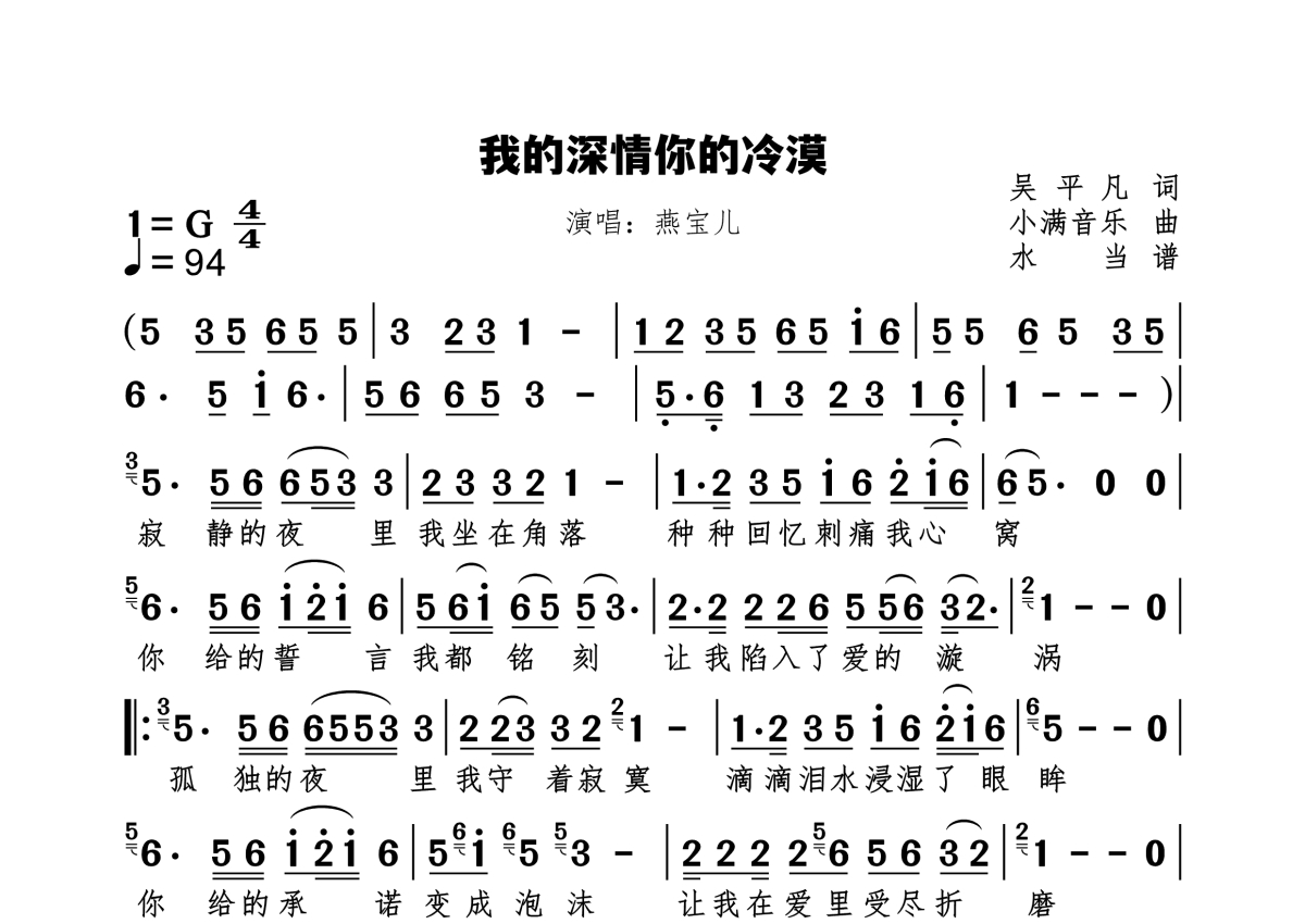 《我的深情你的冷漠》是燕宝儿演唱的一首歌曲,拍号为4/4拍,歌曲速度为每分钟94拍,这份简谱共有一张高清图谱,图谱由 @水当 编配上传。