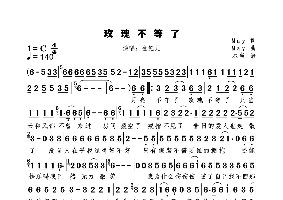《玫瑰不等了》是金钰儿演唱的一首歌曲,拍号为4/4拍,歌曲速度为每分钟140拍,这份简谱共有一张高清图谱,图谱由 @水当 编配上传。