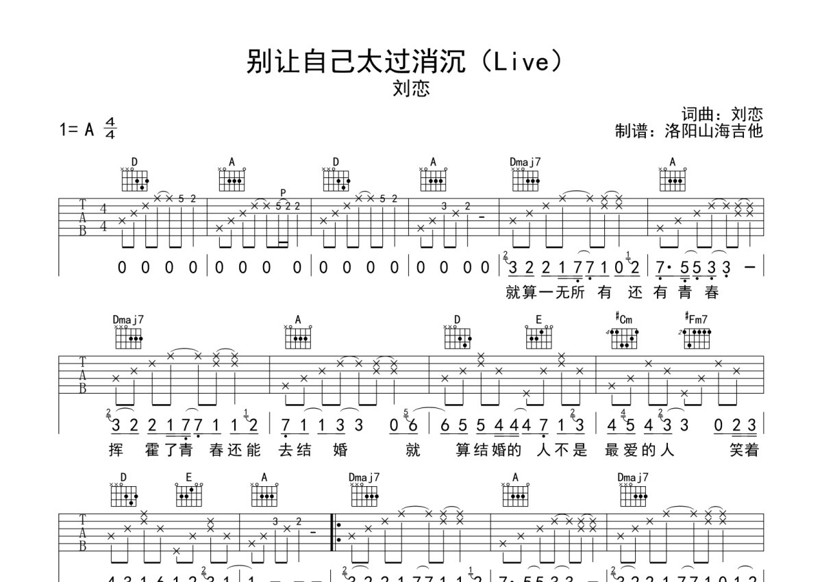 刘恋《别让自己太过消沉》吉他谱 - A调弹唱六线谱