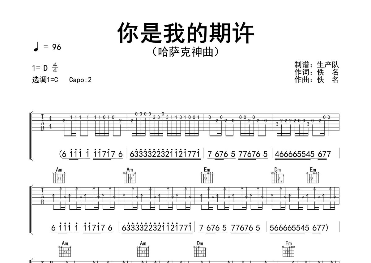《你是我的期许(中文版)》是中文版演唱的一首歌曲,精编完美版,拍号为4/4拍,歌曲速度为每分钟96拍,歌曲原调为D调,但由于原调指法比较难,为了方便弹奏,本吉他谱采用的是C调指法编配,变调夹2品弹奏即为原调,当然也可以根据自己的音域改变变调夹位置,或者通过改变和弦调性,以方便自己弹奏,这份吉他谱共有三张高清图谱,图谱由 @生产队 编配上传,图谱使用六线谱编配,包含吉他和弦指法、简谱以及歌词部分,使用这份你是我的期许(中文版)吉他谱,可以让你更加方便地掌握这首歌曲的弹唱技巧,快来尝试吧。哈萨克神曲《你是我的期许》(中文版)原版吉他谱,精准的前奏,间奏,尾奏solo编配,精编完美版,优质推荐!。