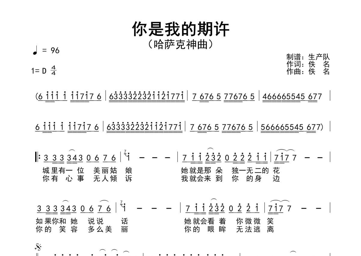 《你是我的期许(中文版)》是中文版演唱的一首歌曲,原版简谱,拍号为4/4拍,歌曲速度为每分钟96拍,这份简谱共有一张高清图谱,图谱由 @生产队 编配上传哈萨克神曲《你是我的期许》(中文版)原版简谱,精准的前奏,间奏,尾奏solo编配,精编完美版,优质推荐!。