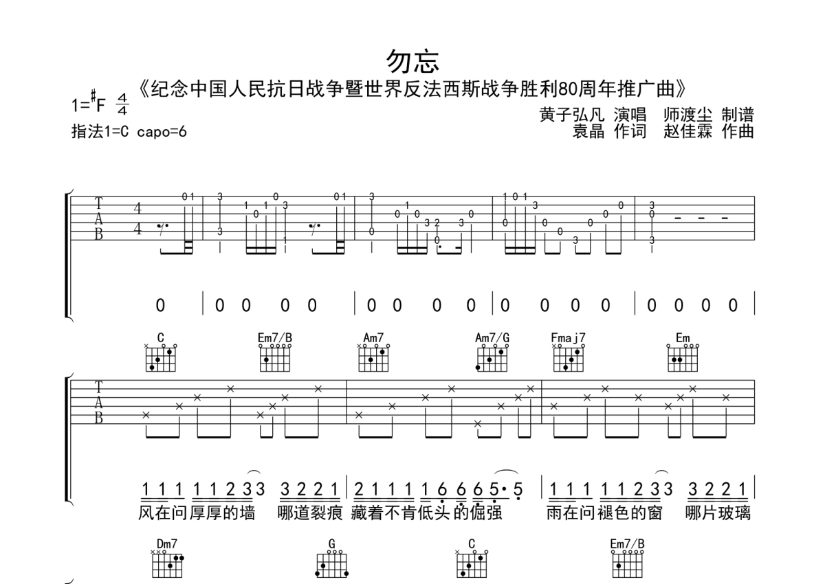 《勿忘》是黄子弘凡演唱的一首歌曲,拍号为4/4拍,歌曲原调为Gb调,但由于原调指法比较难,为了方便弹奏,本吉他谱采用的是C调指法编配,变调夹6品弹奏即为原调,当然也可以根据自己的音域改变变调夹位置,或者通过改变和弦调性,以方便自己弹奏,这份吉他谱共有四张高清图谱,图谱由 @师渡尘 编配上传,图谱使用六线谱编配,包含吉他和弦指法、简谱以及歌词部分,曲谱配备了相关的音频提供试听,使用这份勿忘吉他谱,可以让你更加方便地掌握这首歌曲的弹唱技巧,快来尝试吧。黄子弘凡演唱的《勿忘》,是纪念中国人民抗日战争暨世界反法西斯战争胜利80周年推广曲,本谱采用C调指法编配,原调#F,变调夹6品演奏。