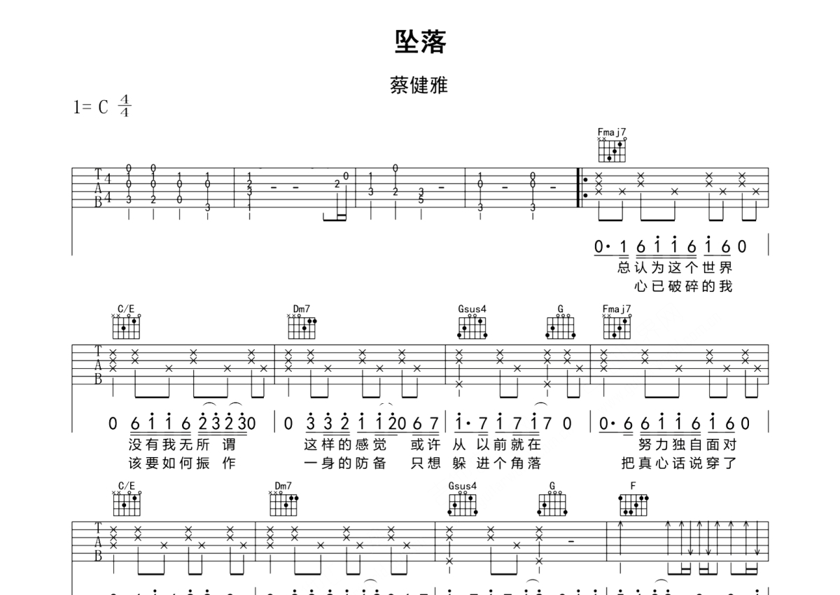 坠落吉他谱 - 蔡健雅演唱 - C调弹唱六线谱