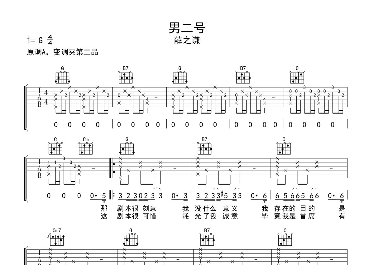 薛之谦《男二号》吉他谱 - G调弹唱六线谱