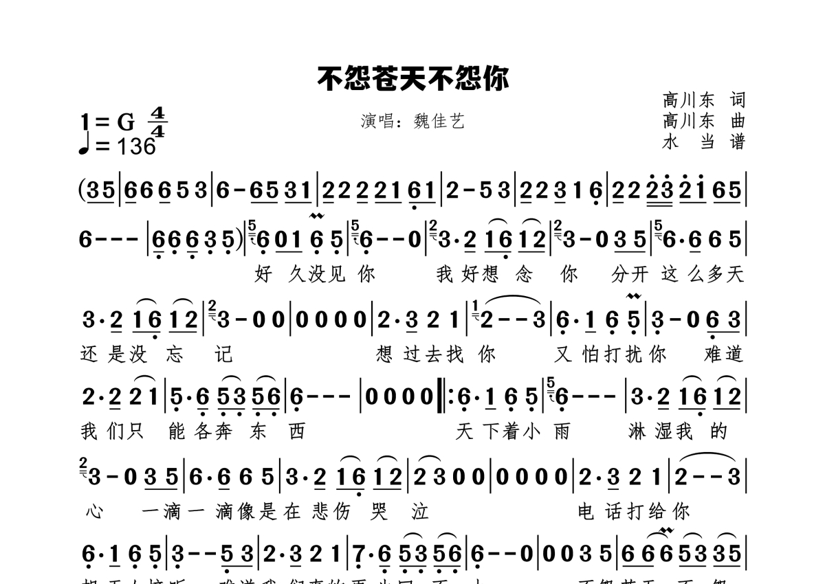《不怨苍天不怨你》是魏佳艺演唱的一首歌曲,拍号为4/4拍,歌曲速度为每分钟136拍,这份简谱共有一张高清图谱,图谱由 @水当 编配上传。