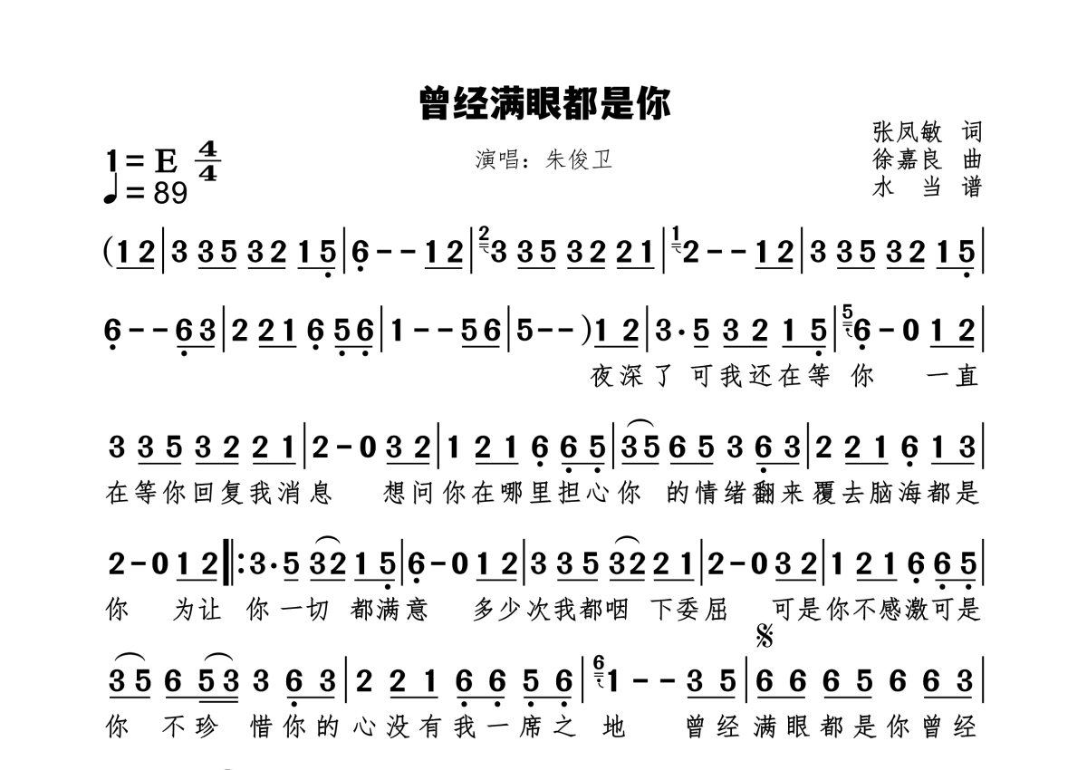 《曾经满眼都是你》是朱俊卫演唱的一首歌曲,拍号为4/4拍,歌曲速度为每分钟89拍,这份简谱共有一张高清图谱,图谱由 @水当 编配上传。