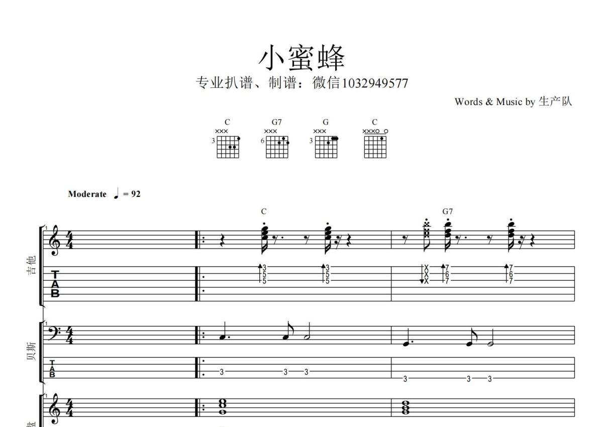 《小蜜蜂》是儿歌演唱的一首歌曲,乐队总谱,拍号为4/4拍,歌曲速度为每分钟92拍,这份乐队总谱共有一张高清图谱,图谱由 @生产队 编配上传经典儿歌《小蜜蜂》乐队总谱,含:吉他、贝斯、键盘、架子鼓、口风琴、主旋律共6轨。完整版购买后请下载PDF文件。
