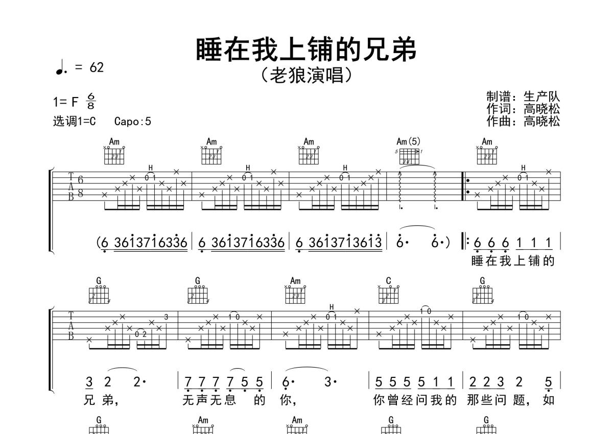 《睡在我上铺的兄弟》是老狼演唱的一首歌曲,精编完美版,拍号为6/8拍,歌曲速度为每分钟62拍,歌曲原调为F调,但由于原调指法比较难,为了方便弹奏,本吉他谱采用的是C调指法编配,变调夹5品弹奏即为原调,当然也可以根据自己的音域改变变调夹位置,或者通过改变和弦调性,以方便自己弹奏,这份吉他谱共有三张高清图谱,图谱由 @生产队 编配上传,图谱使用六线谱编配,包含吉他和弦指法、简谱以及歌词部分,使用这份睡在我上铺的兄弟吉他谱,可以让你更加方便地掌握这首歌曲的弹唱技巧,快来尝试吧。老狼演唱的经典民谣歌曲《睡在我上铺的兄弟》原版吉他谱,含前奏、间奏、尾奏solo编配,精编完美版,怀旧经典!。