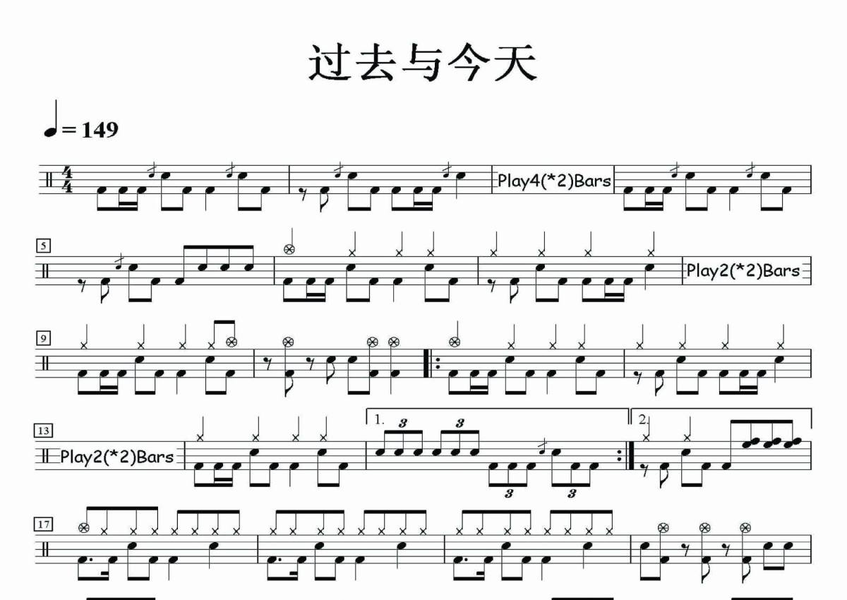 《过去与今天》是Beyond演唱的一首歌曲,拍号为4/4拍,歌曲速度为每分钟149拍,这份架子鼓谱共有三张高清图谱,图谱由 @音符喷血者 编配上传,图谱使用五线谱编配,使用这份过去与今天架子鼓谱,你将能够轻松地敲打出这首Beyond的过去与今天,快来尝试吧。