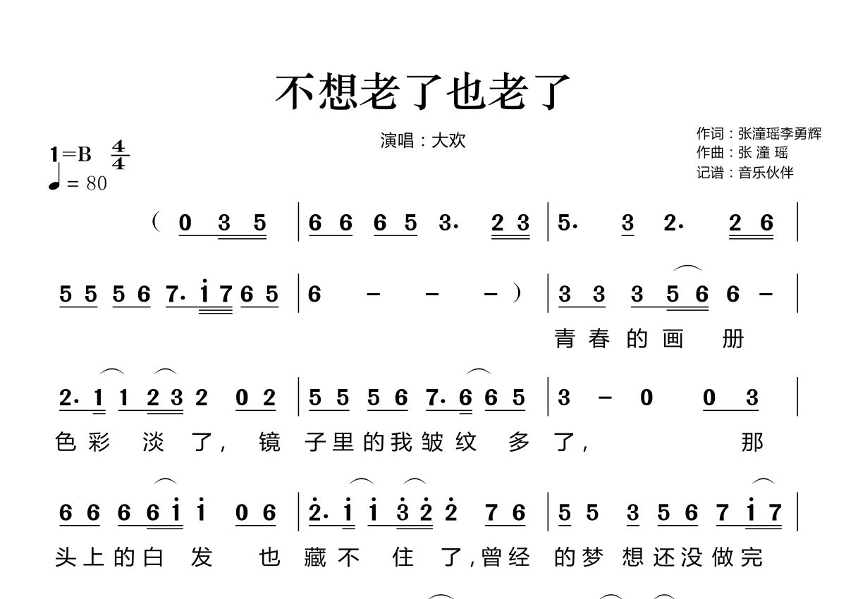 《不想老了也老了》是大欢演唱的一首歌曲,拍号为4/4拍,歌曲速度为每分钟80拍,这份简谱共有两张高清图谱,图谱由 @音乐伙伴 编配上传。