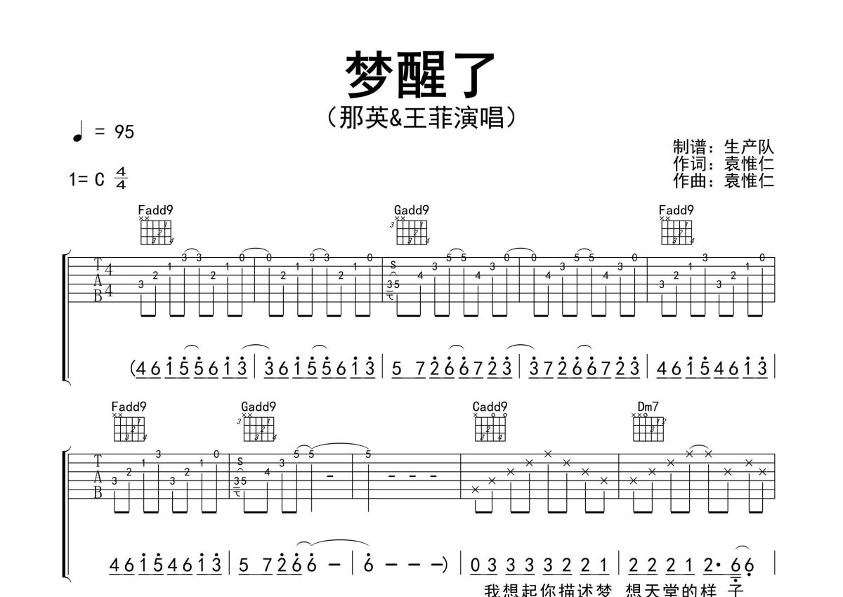 《梦醒了》是那英&王菲演唱的一首歌曲,精编完美版,拍号为4/4拍,歌曲速度为每分钟95拍,歌曲原调为C调,本吉他谱采用的是C调指法编配,演奏时不需要使用变调夹即为原调,这份吉他谱共有三张高清图谱,图谱由 @生产队 编配上传,图谱使用六线谱编配,包含吉他和弦指法、简谱以及歌词部分,使用这份梦醒了吉他谱,可以让你更加方便地掌握这首歌曲的弹唱技巧,快来尝试吧。那英&王菲演唱的歌曲《梦醒了》原版吉他谱,含前奏、间奏solo编配,精编完美版,怀旧经典!。