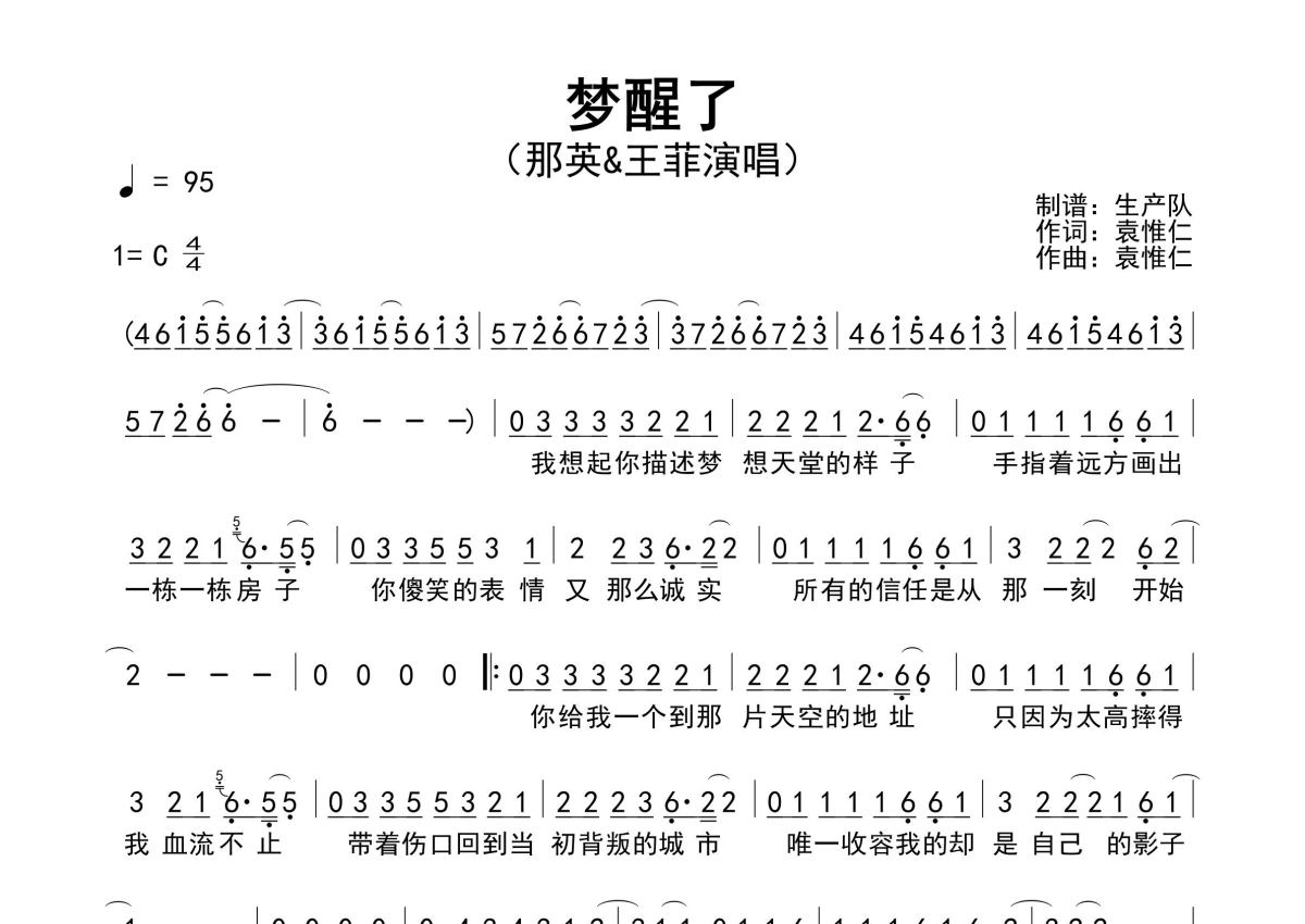 《梦醒了》是那英&王菲演唱的一首歌曲,原版简谱,拍号为4/4拍,歌曲速度为每分钟95拍,这份简谱共有一张高清图谱,图谱由 @生产队 编配上传那英&王菲演唱的歌曲《梦醒了》原版简谱,含前奏、间奏solo编配,精编完美版,怀旧经典!。