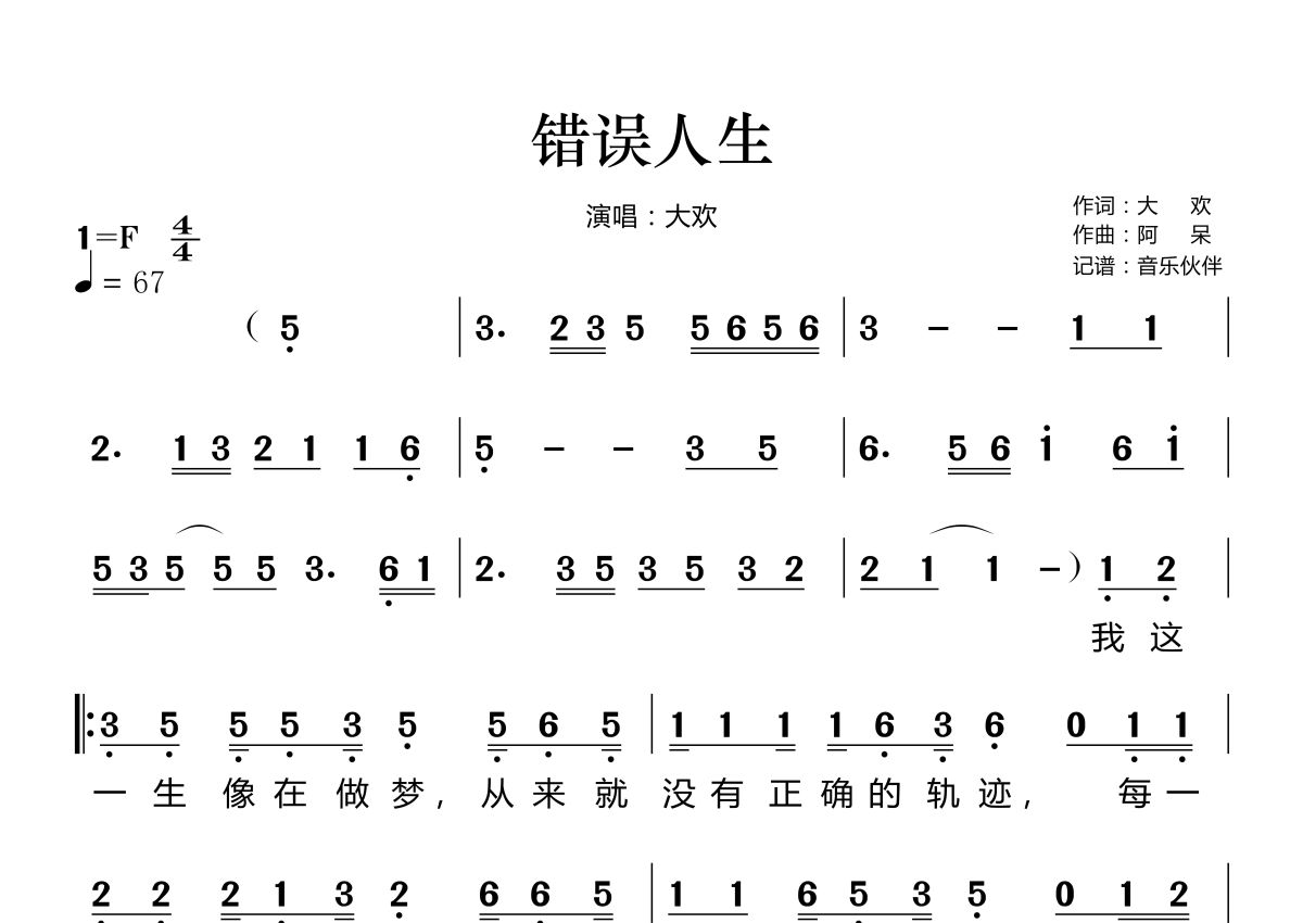 《错误人生》是大欢演唱的一首歌曲,拍号为4/4拍,歌曲速度为每分钟67拍,这份简谱共有两张高清图谱,图谱由 @音乐伙伴 编配上传。