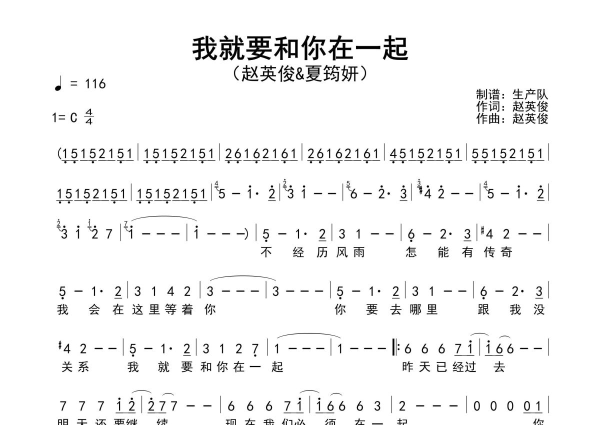 《我就要和你在一起》是赵英俊&夏筠妍演唱的一首歌曲,原版简谱,拍号为4/4拍,歌曲速度为每分钟116拍,这份简谱共有一张高清图谱,图谱由 @生产队 编配上传赵英俊&夏筠妍演唱的歌曲《我就要和你在一起》原版简谱,含前奏、间奏、尾奏solo编配,该曲是电影《人再囧途之泰囧》的主题曲兼插曲,精编完美版,怀旧经典。