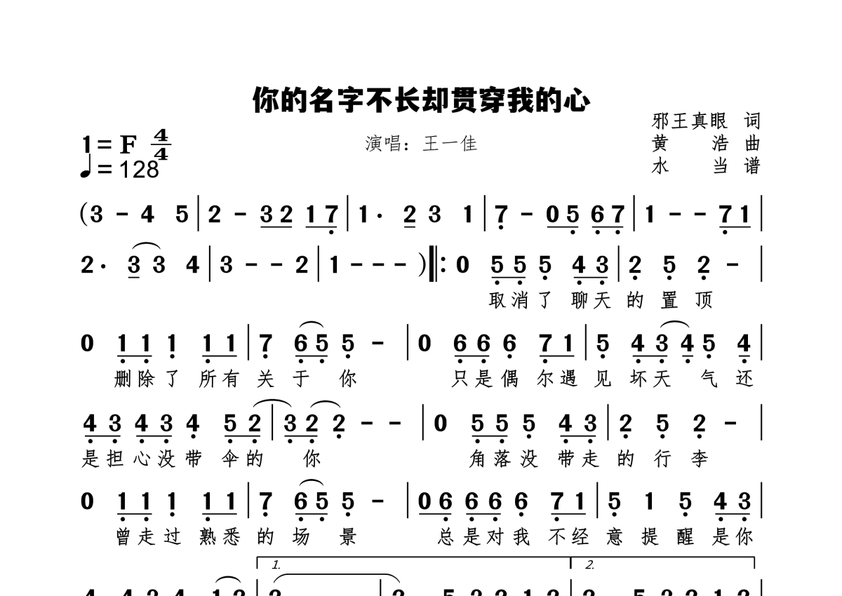 你的名字不长却贯穿我的心简谱 - 王一佳演唱