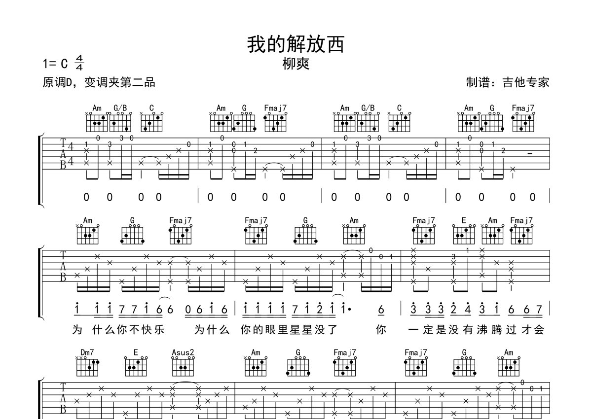 柳爽《我的解放西》吉他谱 - C调弹唱六线谱