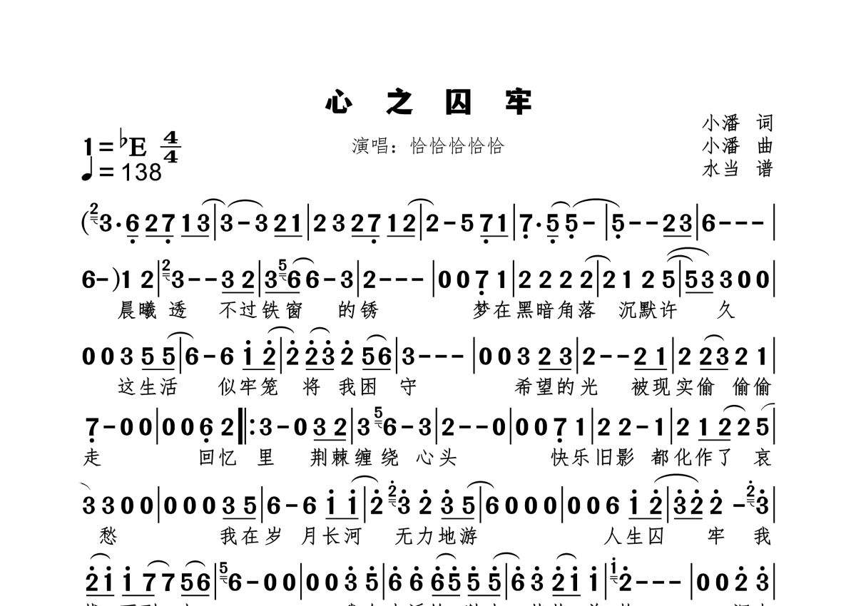 《心之囚牢》是恰恰恰恰恰演唱的一首歌曲,拍号为4/4拍,歌曲速度为每分钟138拍,这份简谱共有一张高清图谱,图谱由 @水当 编配上传。