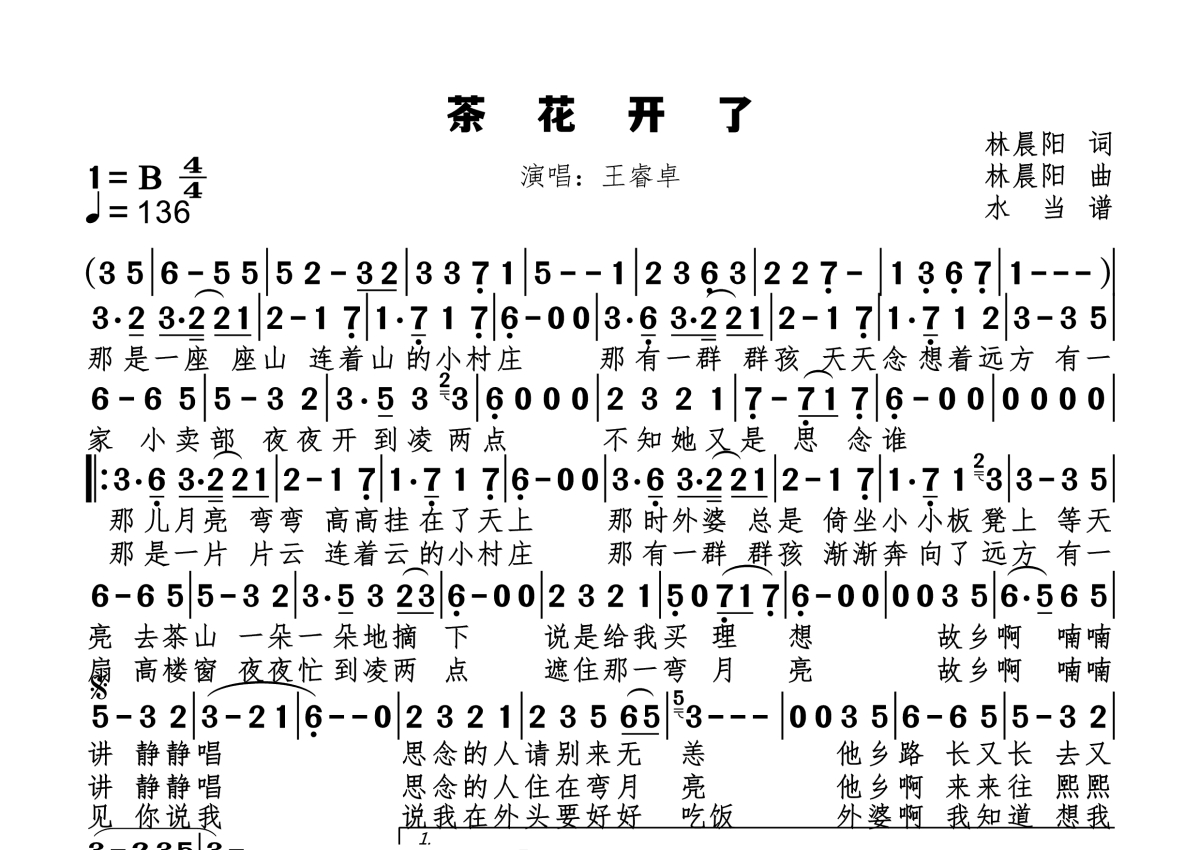 《茶花开了》是王睿卓演唱的一首歌曲,拍号为4/4拍,歌曲速度为每分钟136拍,这份简谱共有一张高清图谱,图谱由 @水当 编配上传。
