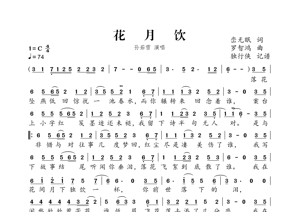 《花月饮》是孙茹雪演唱的一首歌曲,拍号为4/4拍,歌曲速度为每分钟74拍,这份简谱共有一张高清图谱,图谱由 @独行侠 编配上传。