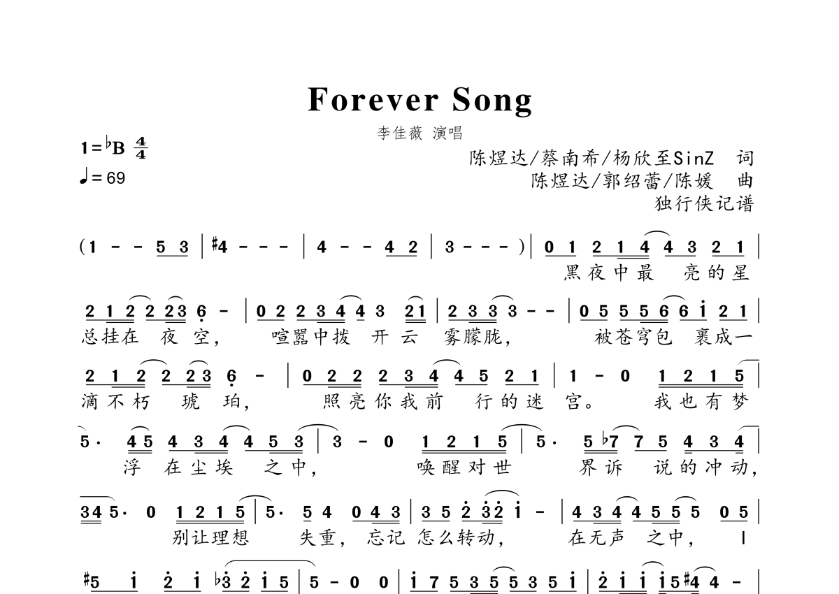 《Forever Song》是李佳薇演唱的一首歌曲,拍号为4/4拍,歌曲速度为每分钟69拍,这份简谱共有两张高清图谱,图谱由 @独行侠 编配上传。