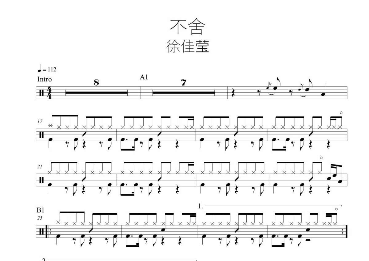 《不舍》是徐佳莹演唱的一首歌曲,原版,拍号为4/4拍,歌曲速度为每分钟112拍,这份架子鼓谱共有三张高清图谱,图谱由 @Breaken_cheung 编配上传,图谱使用五线谱编配,使用这份不舍架子鼓谱,你将能够轻松地敲打出这首徐佳莹的不舍,快来尝试吧。