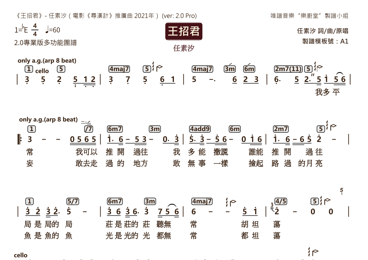 《王招君》是任素汐演唱的一首歌曲,2.0版多功能团谱,这份乐队总谱共有两张高清图谱,图谱由 @唯谱音乐"乐厨堂"发布小组 编配上传。