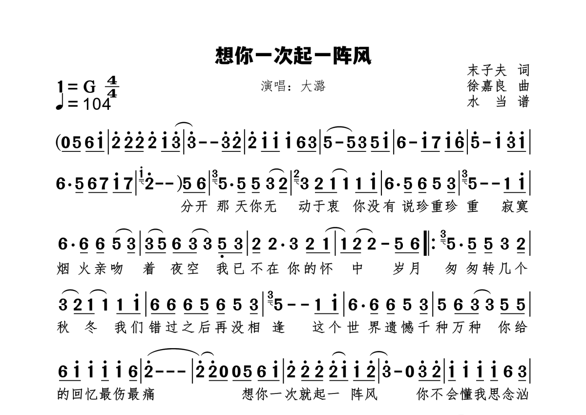 《想你一次起一阵风》是大潞演唱的一首歌曲,拍号为4/4拍,歌曲速度为每分钟104拍,这份简谱共有一张高清图谱,图谱由 @水当 编配上传。