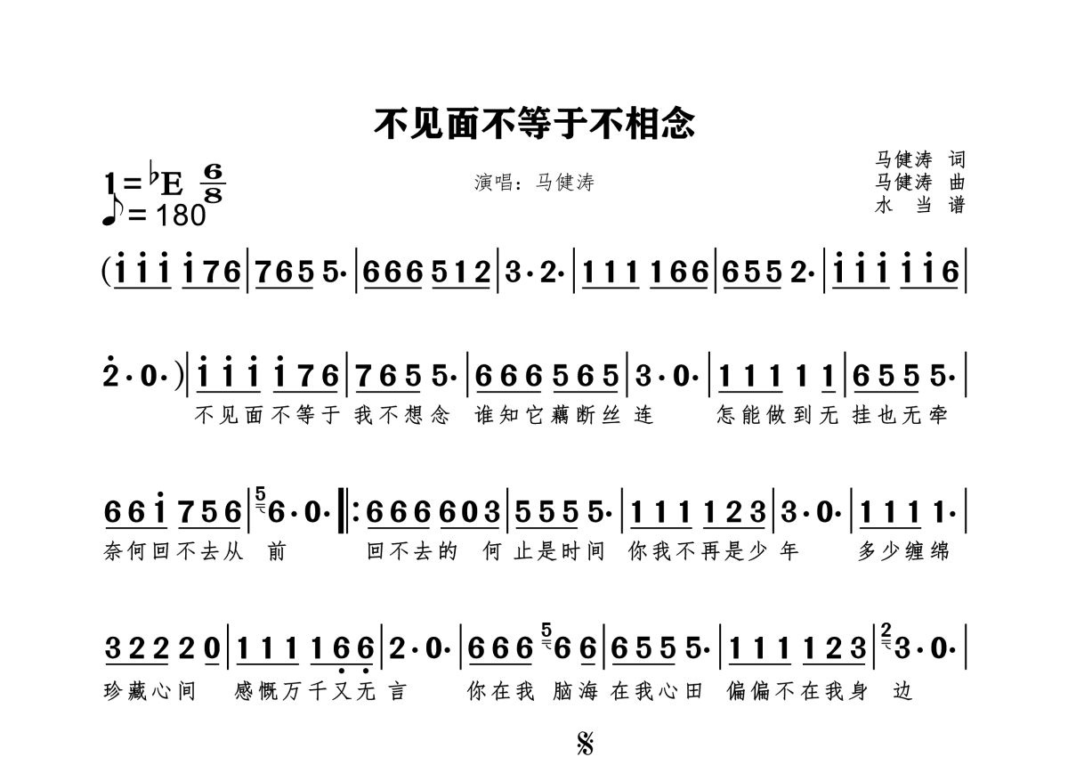 《不见面不等于不相念》是马健涛演唱的一首歌曲,拍号为6/8拍,歌曲速度为每分钟180拍,这份简谱共有一张高清图谱,图谱由 @水当 编配上传。
