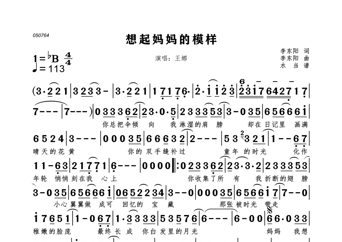 《想起妈妈的模样》是王娜演唱的一首歌曲,拍号为4/4拍,歌曲速度为每分钟113拍,这份简谱共有一张高清图谱,图谱由 @水当 编配上传。