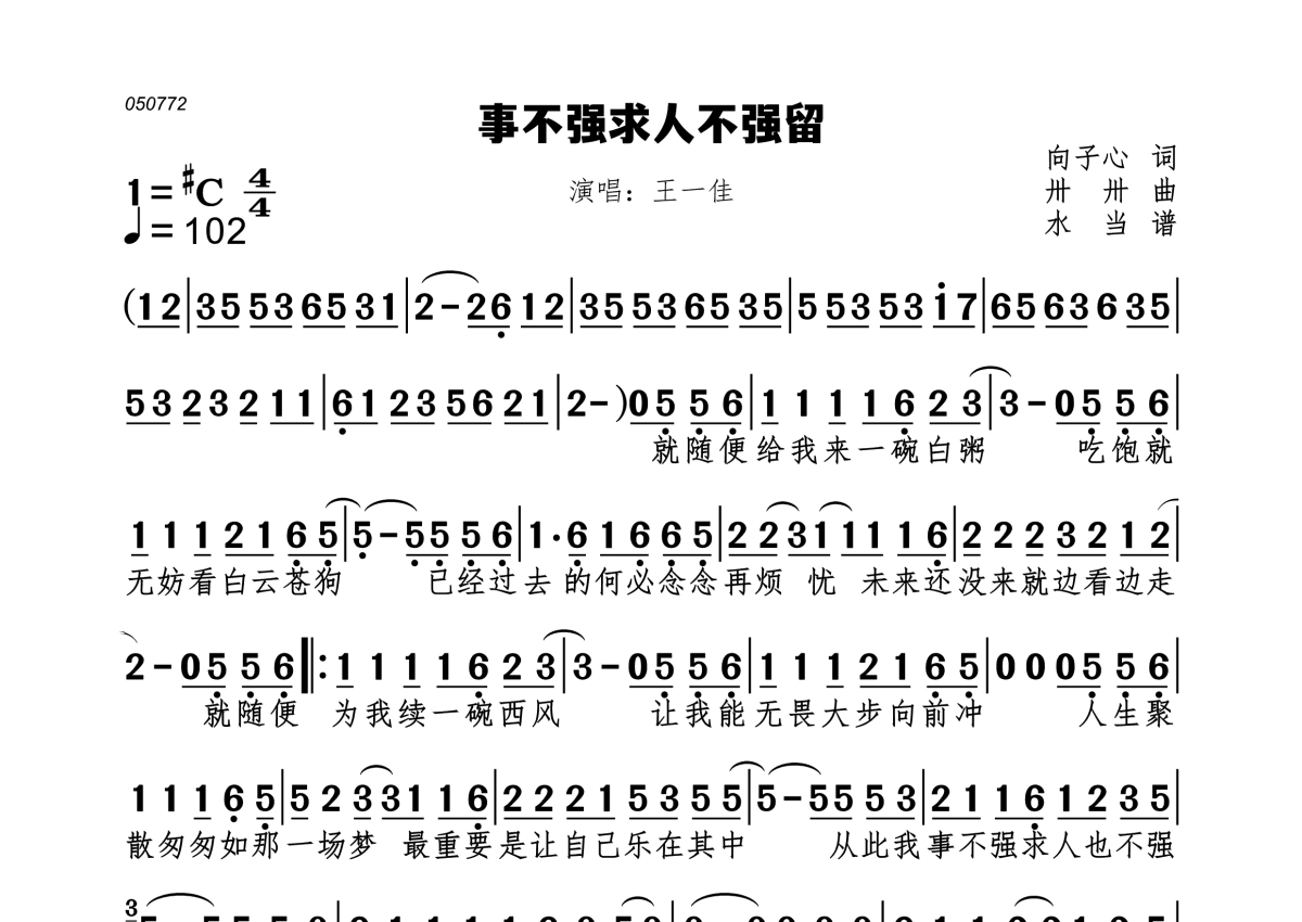 《事不强求人不强留》是王一佳演唱的一首歌曲,拍号为4/4拍,歌曲速度为每分钟102拍,这份简谱共有一张高清图谱,图谱由 @水当 编配上传。