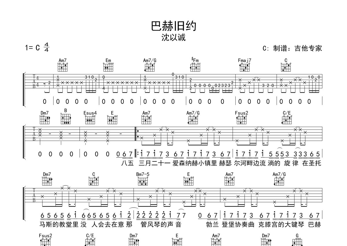 沈以诚《巴赫旧约》吉他谱 - C调弹唱六线谱