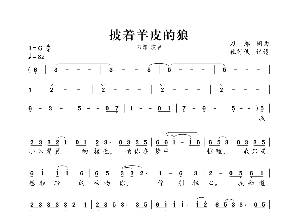 《披着羊皮的狼》是刀郎演唱的一首歌曲,拍号为4/4拍,歌曲速度为每分钟82拍,这份简谱共有三张高清图谱,图谱由 @独行侠 编配上传。