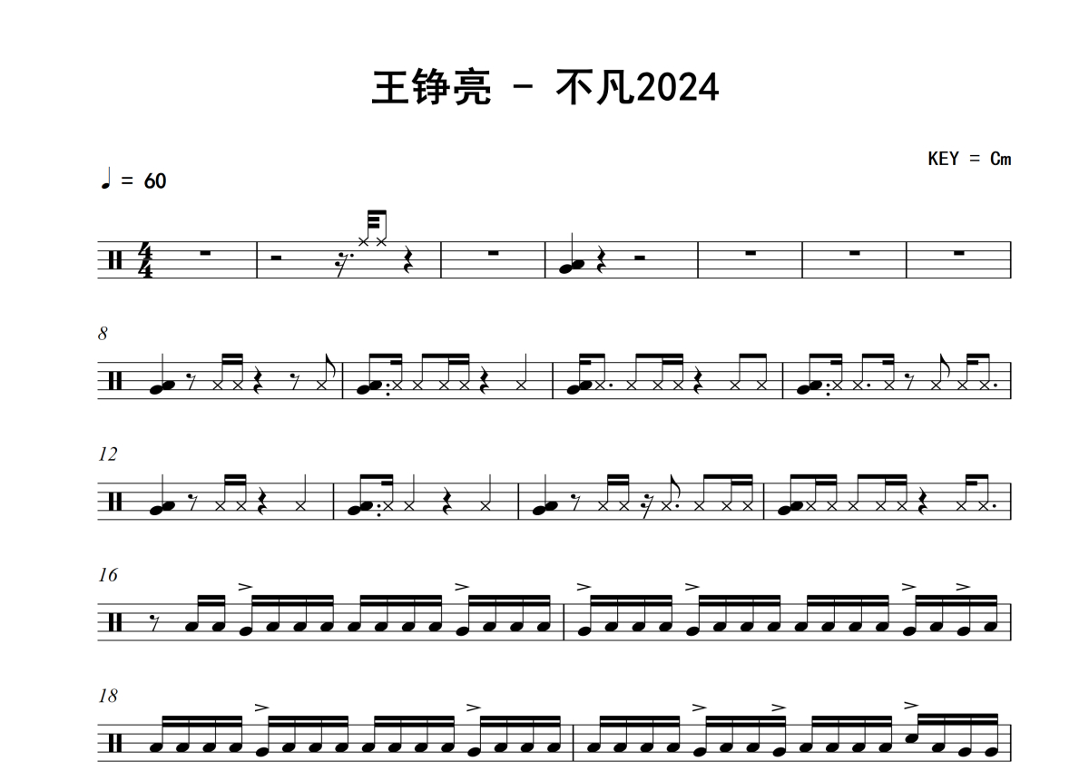 《不凡2024》是王铮亮演唱的一首歌曲,拍号为4/4拍,歌曲速度为每分钟60拍,这份架子鼓谱共有两张高清图谱,图谱由 @老虎不说谎 编配上传,图谱使用五线谱编配,使用这份不凡2024架子鼓谱,你将能够轻松地敲打出这首王铮亮的不凡2024,快来尝试吧。