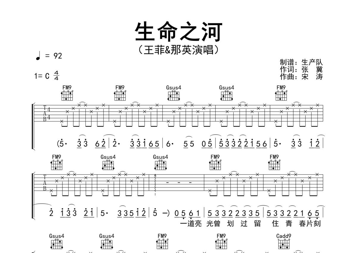 《生命之河》是王菲&那英演唱的一首歌曲,精编完美版,拍号为4/4拍,歌曲速度为每分钟92拍,歌曲原调为C调,本吉他谱采用的是C调指法编配,演奏时不需要使用变调夹即为原调,这份吉他谱共有三张高清图谱,图谱由 @生产队 编配上传,图谱使用六线谱编配,包含吉他和弦指法、简谱以及歌词部分,使用这份生命之河吉他谱,可以让你更加方便地掌握这首歌曲的弹唱技巧,快来尝试吧。王菲&那英演唱的歌曲《生命之河》原版吉他谱,含:前奏、间奏、尾奏solo编配,精编完美版,优质推荐!。