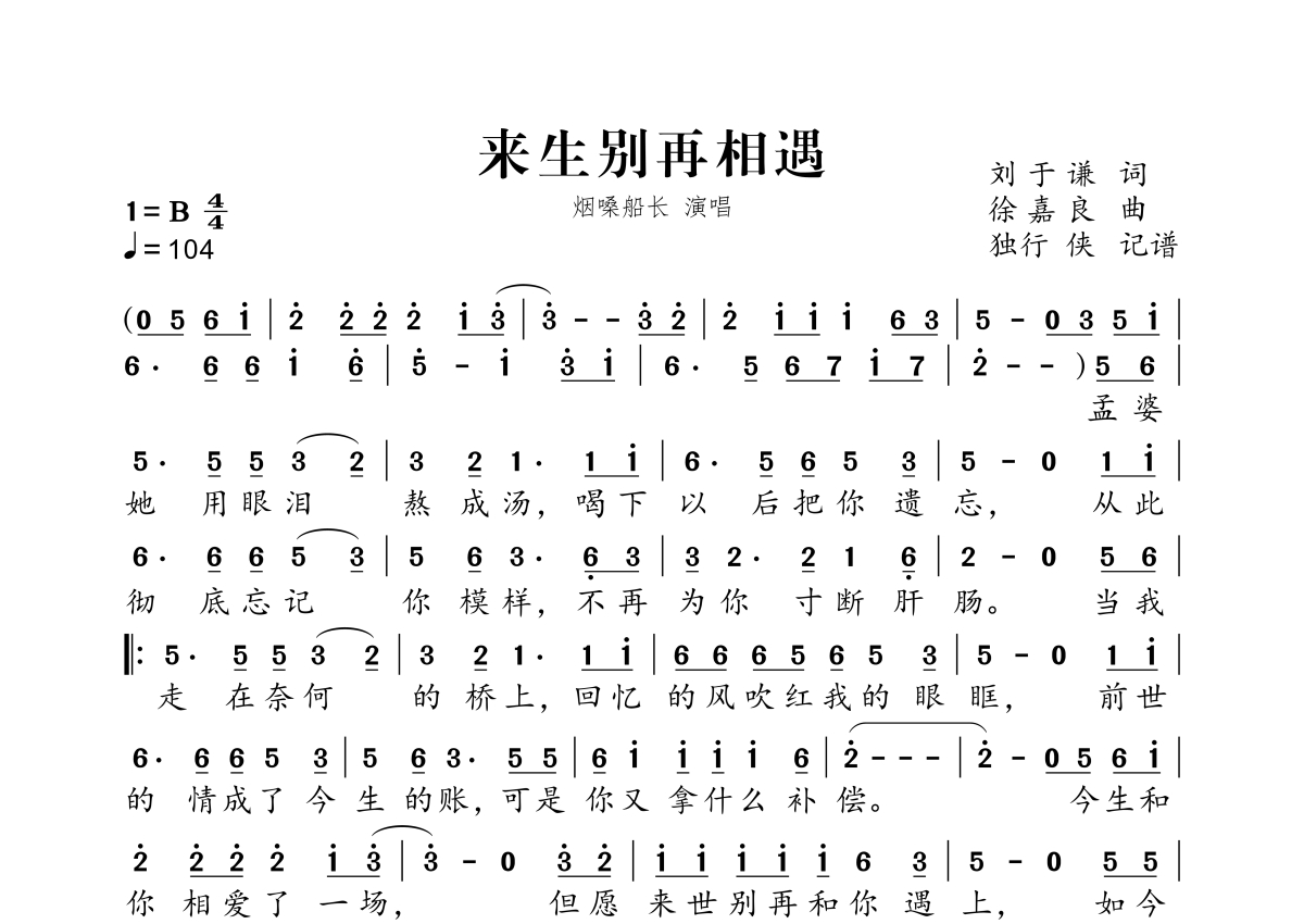 《来生别再相遇》是烟嗓船长演唱的一首歌曲,拍号为4/4拍,歌曲速度为每分钟104拍,这份简谱共有一张高清图谱,图谱由 @独行侠 编配上传。