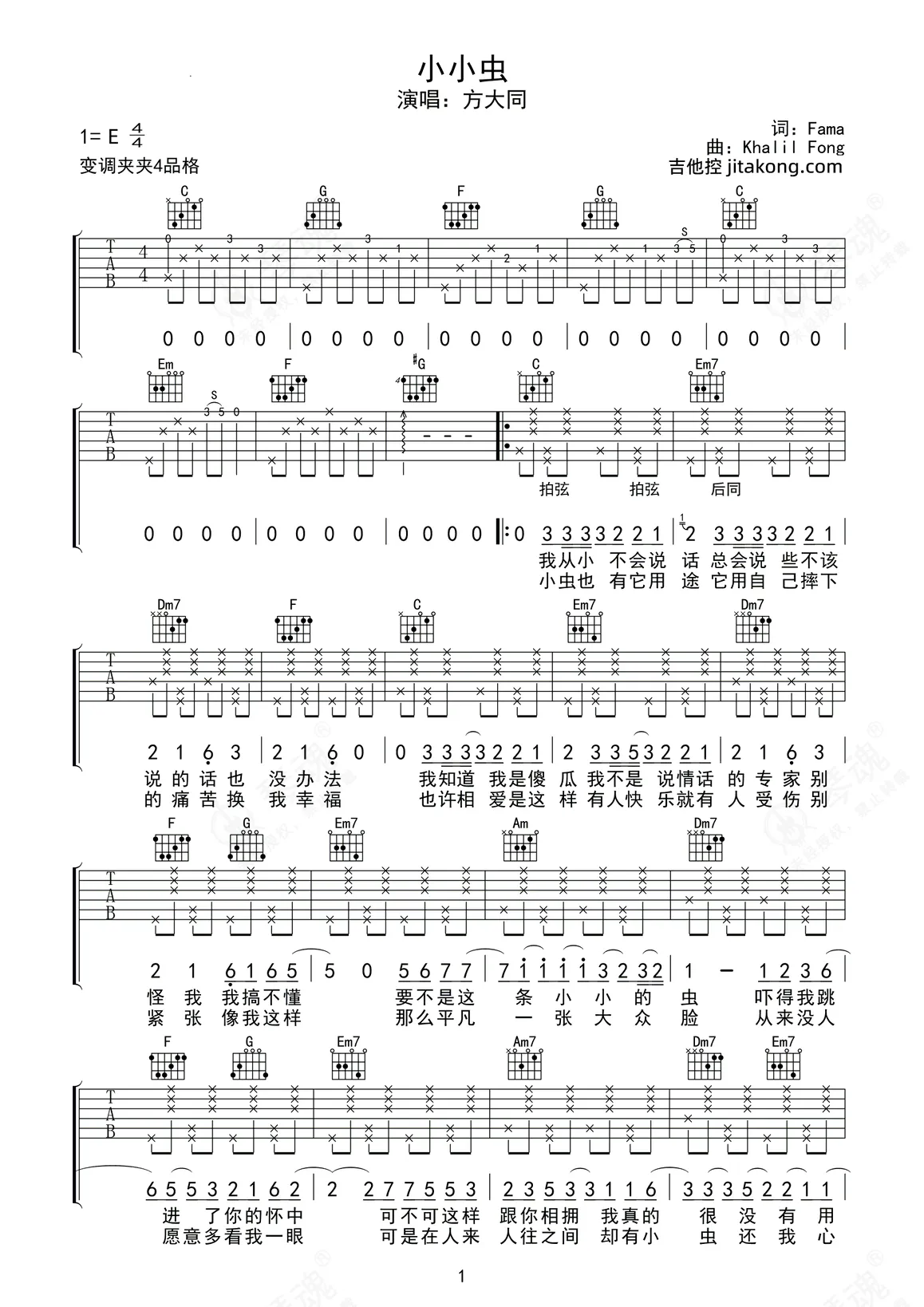 方大同《小小虫》吉他谱 - E调弹唱六线谱