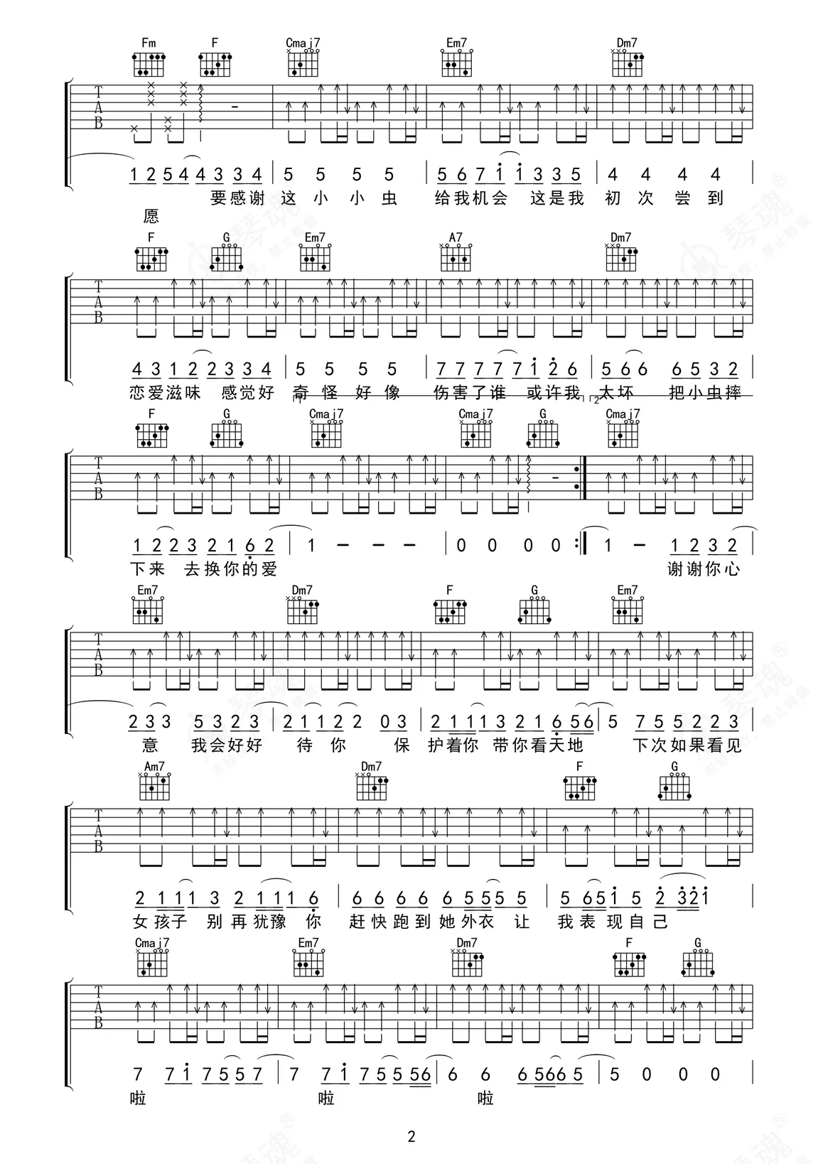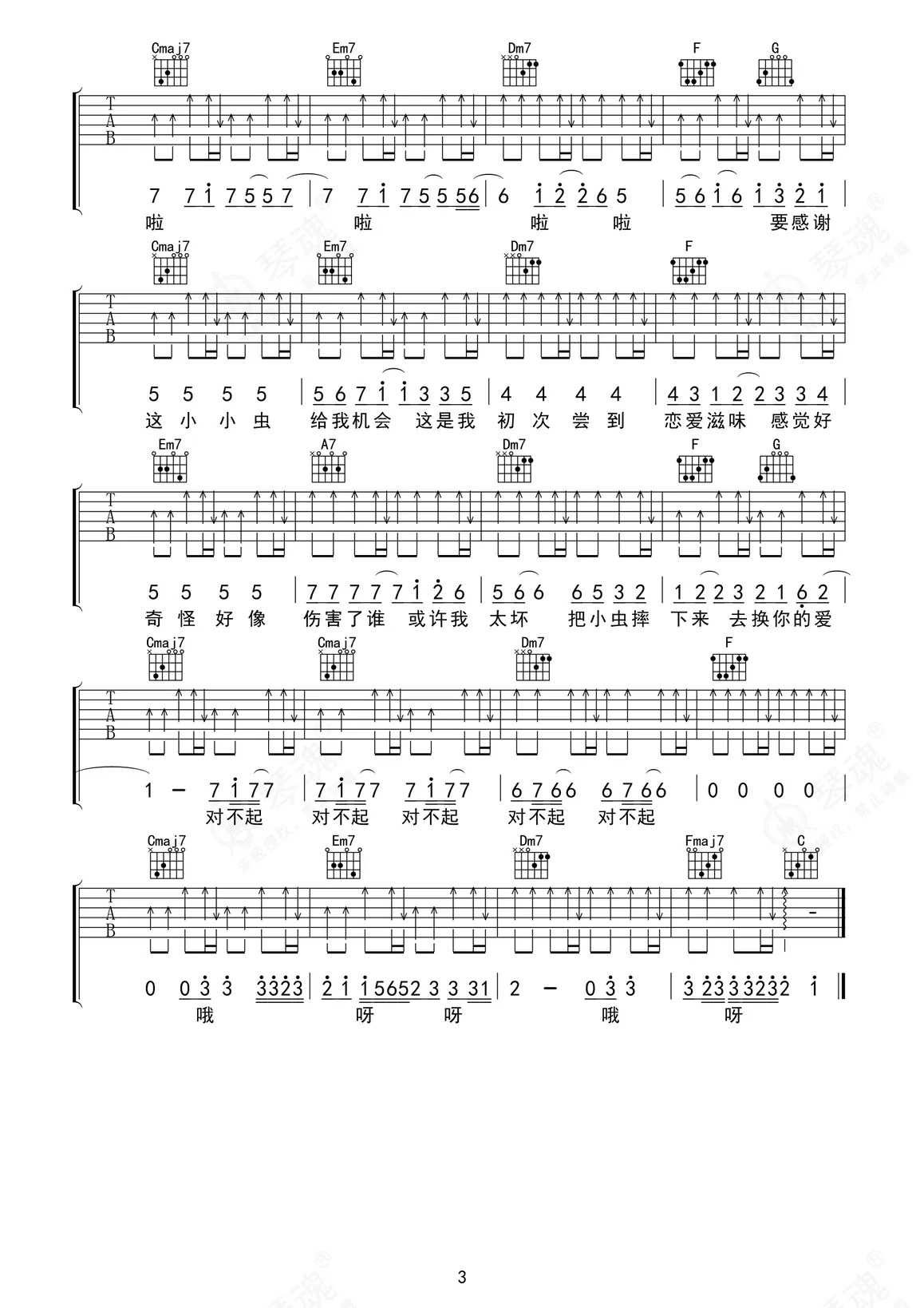 《小小虫》是方大同演唱的一首歌曲,拍号为4/4拍,本吉他谱采用的是E调指法编配,变调夹4品弹奏即为原调,当然也可以根据自己的音域改变变调夹位置,或者通过改变和弦调性,以方便自己弹奏,这份吉他谱共有三张高清图谱,图谱由 @ 编配上传,图谱使用六线谱编配,包含吉他和弦指法、简谱以及歌词部分,使用这份小小虫吉他谱,可以让你更加方便地掌握这首歌曲的弹唱技巧,快来尝试吧。