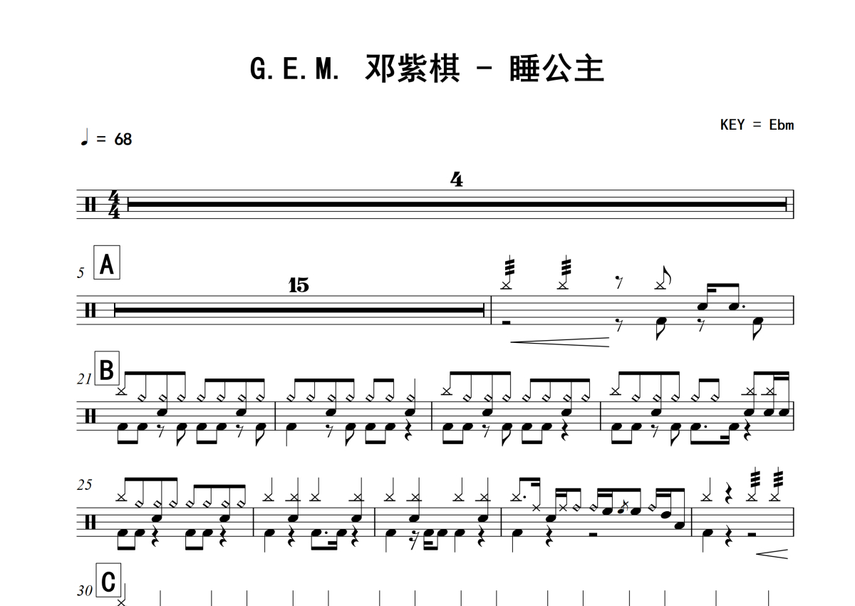 《睡公主》是G.E.M. 邓紫棋演唱的一首歌曲,拍号为4/4拍,歌曲速度为每分钟68拍,这份架子鼓谱共有两张高清图谱,图谱由 @老虎不说谎 编配上传,图谱使用五线谱编配,使用这份睡公主架子鼓谱,你将能够轻松地敲打出这首G.E.M. 邓紫棋的睡公主,快来尝试吧。